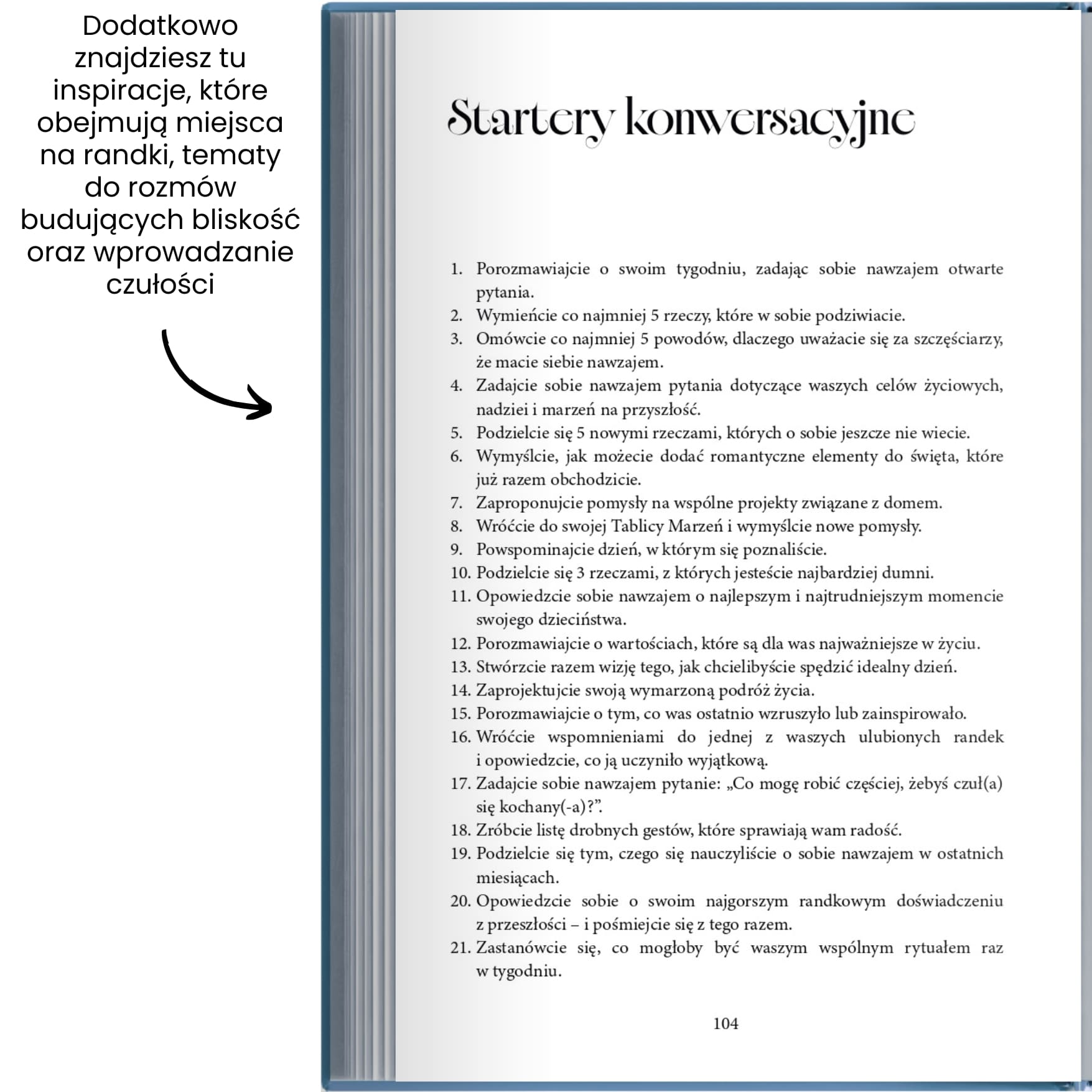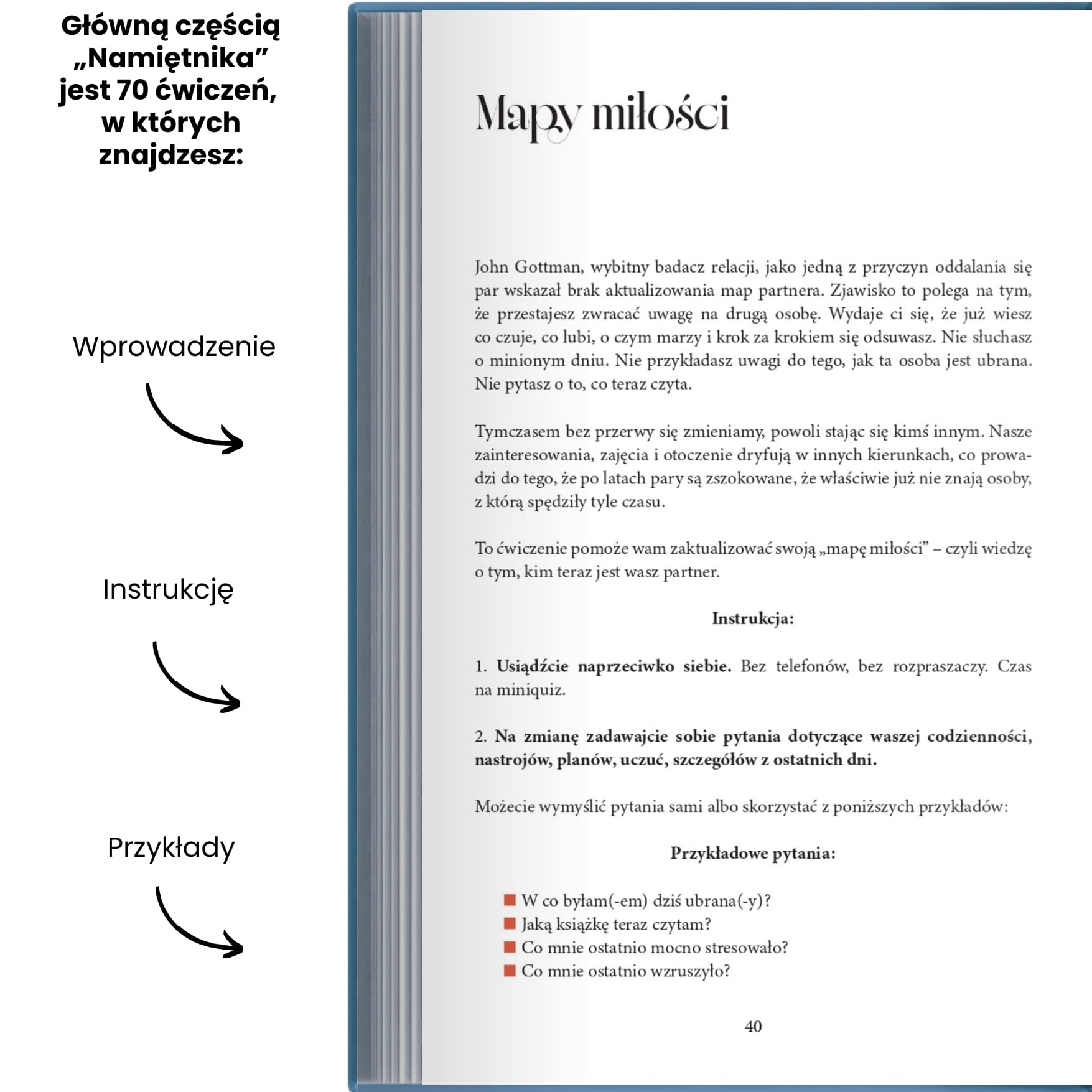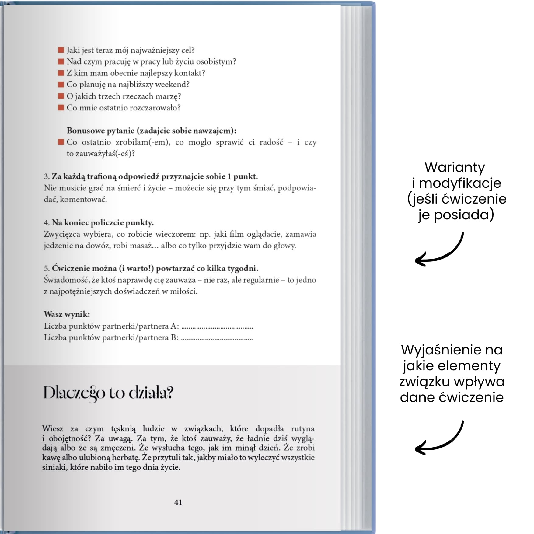 Można wykorzystywać go wielokrotnie. Dzieje się tak z dwóch powodów. Po pierwsze, randki czy zabawy, które znajdziesz w środku, będą wam sprawiać przyjemność nie tylko za pierwszym, ale też za trzecim i piątym razem. Po drugie, każde ćwiczenie zawiera fragment „Dlaczego to działa?”, z którego dowiesz się, jaki ważny element związku ono wspiera. W ten sposób przy okazji nauczysz się lepiej dbać o relację i będziesz wykorzystywać tę wiedzę przez całe życie.